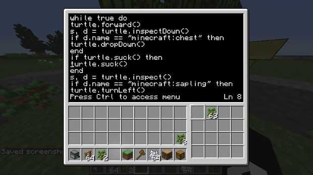 Si se encuentra un elemento caído delante de él, lo recogerá. Si encuentra un pecho por debajo de ella, colocará a todos los elementos en el primer slot (normalmente madera) en el pecho. También, reemplazará un árbol con un pimpollo que va de la segunda ranura en su inventario.
