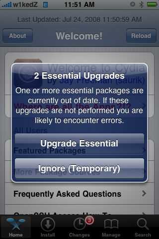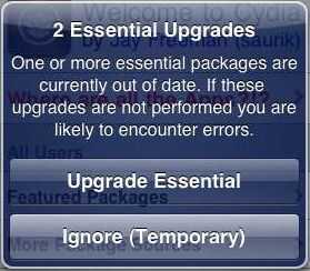Desde aquí si no ejecutas Cydia en un tiempo, o esta es la primera vez que se ejecuta, usted puede conseguir un aviso sobre "Actualizaciones esenciales". Estas son mejoras a la aplicación Cydia sí mismo que puede ser necesario para la instalación de aplicaciones y nuevos paquetes: