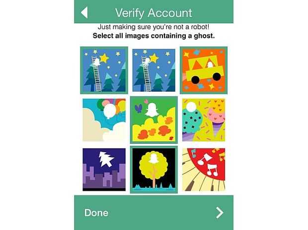 Después de que se haya inscrito en snapchat, su tiempo para verificar su cuenta. El proceso de verificación llevará a través de una serie de imágenes pidiéndole que haga clic en las imágenes que contiene fantasmas en ellos (Snapchats insignia) y luego hacer clic en hecho.