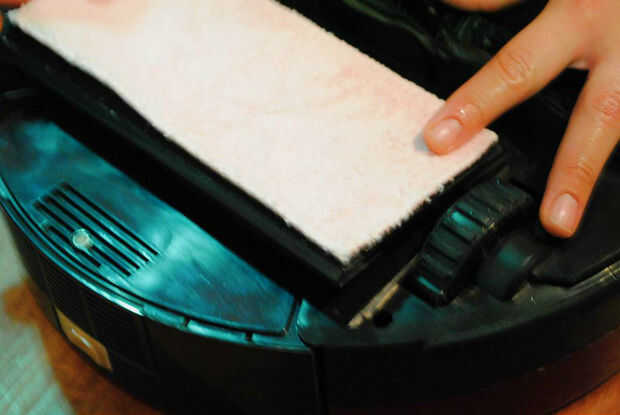Poner el paño mojado encima del adjunto con la cara de Velcro hacia y alinee los dos precisamente. Cuando haya terminado, flip Bob en sus ruedas, le enciendo y escoger un modo de limpieza.