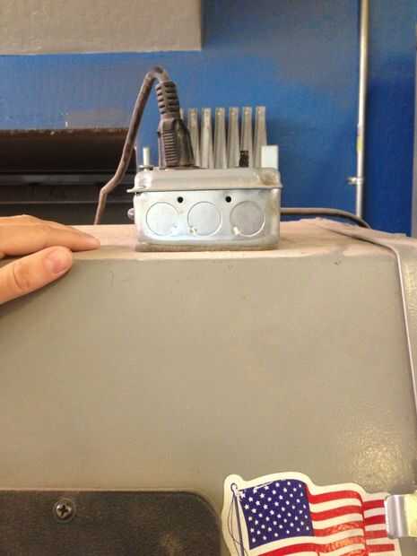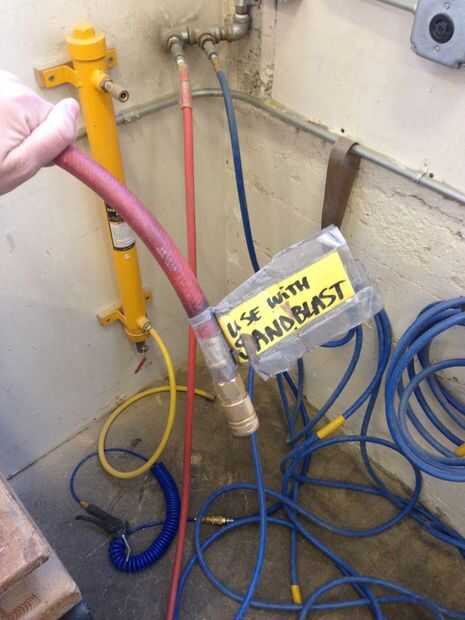 El arenador de la arena tiene que conectarse para trabajar con aire comprimido. En el momento de escribir este Instructable, había una manguera roja con la etiqueta "Uso con chorro de arena" que he usado. Se necesita conectar la manguera roja a la manguera azul asomando de la chorreadora de arena debajo de su puerta. Sostenga ambas mangueras firmemente cuando está conectarlos para que el aire comprimido no azote una de tus manos.