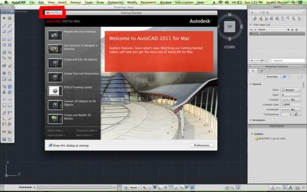 Viuda emergente "getting started" le dará la bienvenida cuando el programa se abre completamente. Haga clic en la "x" roja en la esquina superior izquierda de la caja para descartarlo y pasar a la mesa de dibujo.