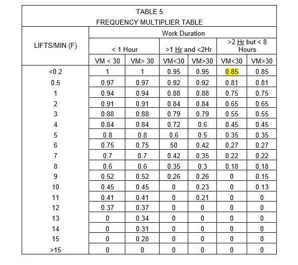 Por ejemplo si se va a levantar en promedio 12 objetos en una hora, un día de trabajo de 5 horas y mi VM se encontró que 25 pulgadas encontraría el valor de tabla que coincida con la duración de trabajo de 5 horas de.2 ascensores/min y una VM < 30. Este valor sería.85, como el resaltado en la tabla anterior.