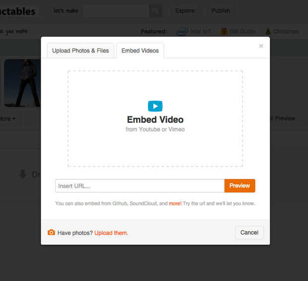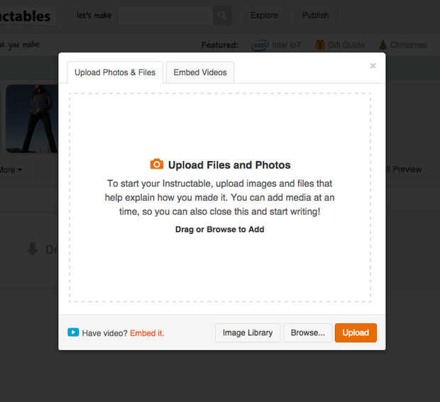 Hay a menudo confusión sobre cómo agregar qué tipo de medios de comunicación a Instructables, y hemos intentado abordarlo en los cambios de diseño. Es para añadir los medios de comunicación de su equipo, mientras que la inclusión es para traer adentro de otra fuente en línea. Imágenes y archivos deben ser cargados, debe agregar video a YouTube o Vimeo, luego incorporado.
