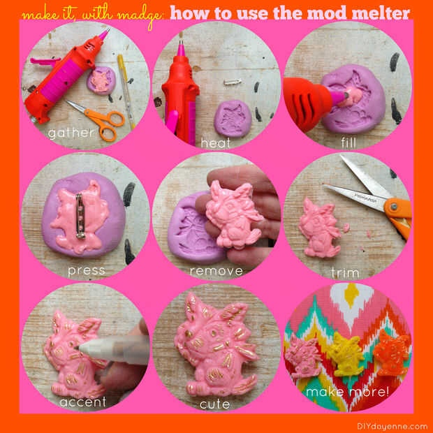 Aquí es un gráfico con los pasos, sólo calor, llenar, agregar pin nuevo, fresco, recortar y embellecer! Hacer tus propios moldes con un dos pieza moldeado masilla o uso los moldes de silicona de la línea se funda el Mod o el pasillo cocina! Eso es todo!