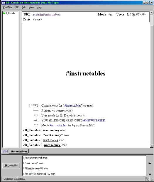 Ahora usted debe ser capaz de usar Chatzilla con algunos conocimientos, así como muchos otros clientes IRC. Deje de usar IE y comenzar a usar Firefox y, la extensión chatzilla (no, no es incluso en el nivel de "dificultad" es juego de niños, por lo que no tienes excusa), y cuando aceptas lo mejor, que va por encima del resto y aprender IRC para descubrir el verdadero cliente de mensajería instantánea que ha existido mucho tiempo antes de YIM o MSN o cualquier otro. Uso el mejor y nunca falta el resto...