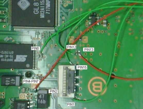 Pin 12 y 13 de Pin, el- + datos USB necesitan estar conectado al menor contacto de las resistencias directamente encima del clip de 15 pines. NEG - está a la izquierda, punto de venta + a la derecha.
