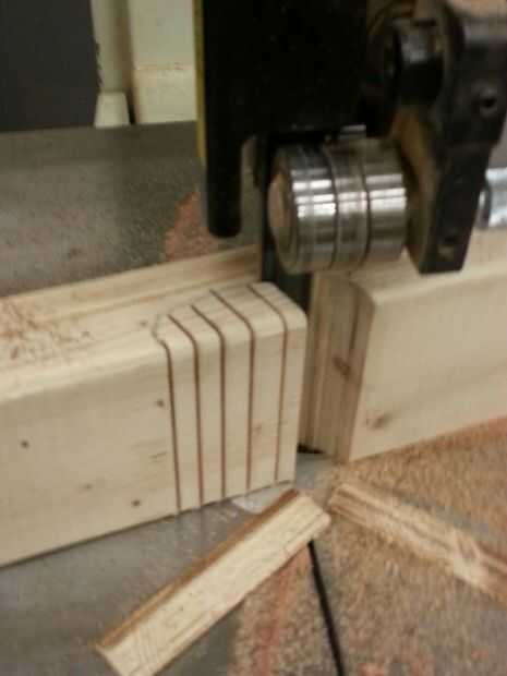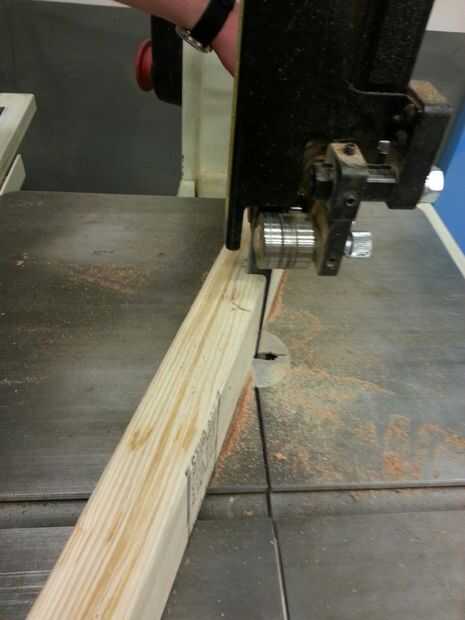 Usando la Sierra de cinta, hacer algunos cortes de alivio a la línea de lápiz. Luego, cortar a lo largo de la línea para completar la muesca.