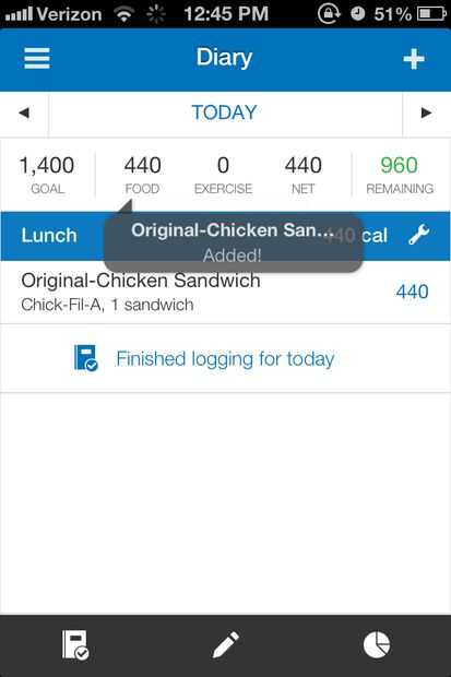 Luego te volverá a tu página de inicio de diario, y las calorías consumidas se verá reflejadas en el número de cuenta de calorías de alimentos y las calorías restantes número.