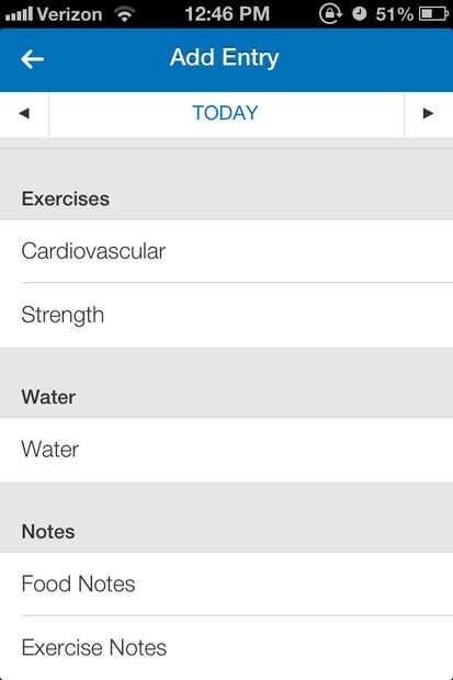 En el menú "Agregar entrada", desplácese hacia abajo hasta que vea que la fila con la etiqueta "Agua" bajo el título "Agua". Toque en la fila de "Agua" para añadir la ingesta de agua.