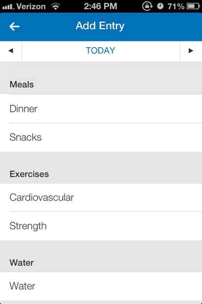 Desplácese hacia abajo hasta la sección titulada "Ejercicios". Seleccione la fila de "Fuerza" o "Cardiovascular" fila pulsando en función del tipo de ejercicios completados. Para este ejemplo, elegimos ejercicios cardiovasculares.