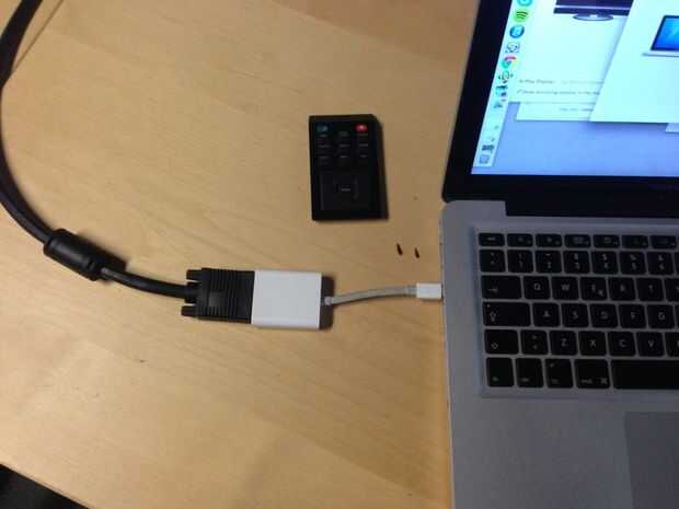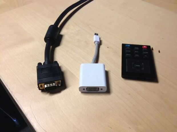 Hay un cable VGA negro desde el proyector que usarás para conectar su computadora. Mi computadora no tiene un puerto VGA pero era capaz de pedir prestado un VGA al adaptador de Mini DisplayPort para conectar mi computadora.