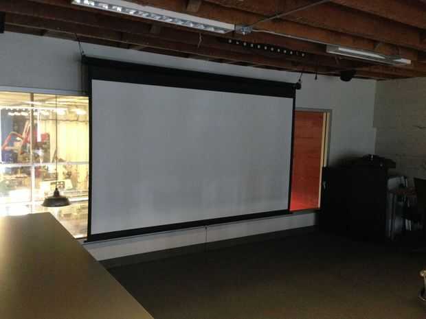 El proyector está montado en el techo y hacia el taller. En primer lugar, tire hacia abajo de la pantalla. También puede apagar las luces y las cortinas.