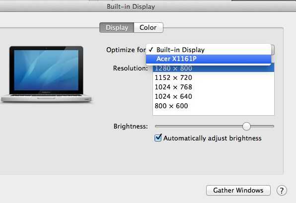 Mi computadora por defecto a una resolución baja 800 por 600px conectándolo al proyector. Para cambiar esto, abrí mi panel de preferencias Pantallas. Dependiendo de que pantalla le pregunté las preferencias para optimizar, tuve una selección diferente de las resoluciones disponibles. Puede intentar algunas resoluciones para determinar que más claro, especialmente si usted necesita presentar el texto.