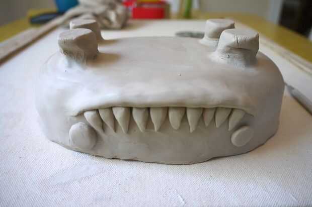 me gustaria dejar la arcilla sobre el molde hasta después de que he puesto en un pie (o pies) y hacer cualquier decoración que quiero hacer a él. También me gusta dejarla secar un poco en el molde. Tal vez una hora o así. Así sale del molde más fácilmente, especialmente si el molde es profundo, como éste es.