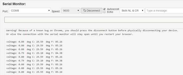 Trate de descargar el plugin codebender y haciendo clic en el funcionamiento botón de Arduino a la placa Arduino con este sketch del programa. Y eso es todo, que has programado tu Arduino con este sketch. Prensa Conecte el botón de abajo para iniciar la comunicación serial y recibir temperatura del sensor.