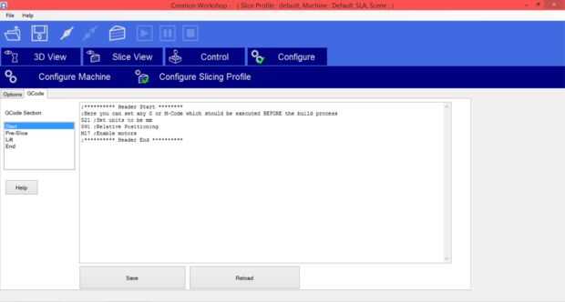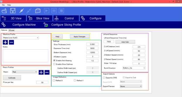 La parte de importación en esta área es el botón calibrar. Esto hará que aparezca una ventana más pequeña, que se puede utilizar para afinar los perfiles. Básicamente, se imprime un montón de paredes, luego cura una capa en los varios intervalos. Esto le permitirá ver a qué hora curado la resina necesita cura. Una vez que se establece el tiempo mínimo, e intervalos, exitoso modelo de prueba de impresión y generará el código y las imágenes para el objeto de la calibración. Asegúrese de que sus ajustes son correctos, como rellenará el resto de la información requerida (como material elevación/secuencia, ajustes y Gcode Inicio y fin) de que configuración actual. Cuando esté listo para imprimir su parte de calibración, puede golpear el botón de play en la parte superior, como lo haría para cualquier impresión.