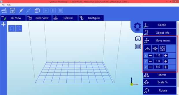 MOVER (m) - esto le permite mover la pieza. Hay varios botones útiles para organizar piezas incluidas. El primero pondrá la parte en la superficie de construcción, la parte de centro será el segundo y el tercero organizará auto partes en la plataforma de la construcción. Arreglo de auto pasará automáticamente cuando usted carga piezas nuevas. Debajo de estos 3 botones son menús de la parte en movimiento en cualquier dirección. Establecer el número de mm para mover, a continuación, haga clic en + o - para mover la pieza a lo largo de ese eje en la dirección especificada.