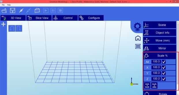 ESCALA - escala le permite ajustar el tamaño de la pieza. Tampoco puede escalar todos los ejes a la vez, o uno a la vez. Además, hay un botón para convertir una parte cargada en pulgadas a milímetros y viceversa.