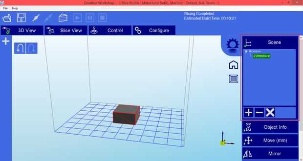 En primer lugar, tienes que cargar una pieza a jugar con. Puede hacer esto haciendo clic en la carpeta en la esquina superior izquierda. Será necesario encontrar un archivo STL para cargar. Elegí un cubo de calibración 20mmx20mmx10mm.