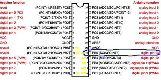 Eso está todo bien, pero no es hasta cerca de lo que realmente está pasando. El Arduino Uno utiliza el microcontrolador ATmega328P-PU. Lo que llama Arduino pin 13 es PB5. Eso significa que es el quinto bit en registro del puerto B. http://www.Arduino.CC/en/hacking/PinMapping168