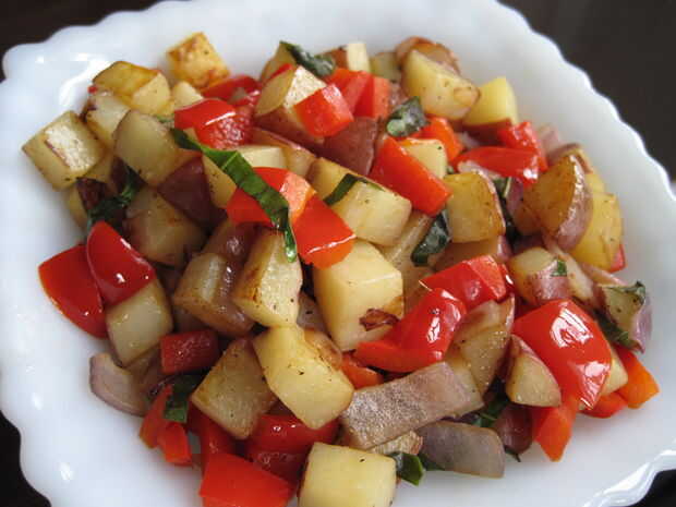 Añadir aceite de oliva a la sartén y y Caliéntalo a fuego medio alto hasta que el aceite brilla. Agregue las papas y cocinar durante unos cinco minutos, hasta que puede olerlos cocinar y están recibiendo ligeramente marrón. Revolver de vez en cuando. Luego agregar la pimienta y bajar el fuego un poco. Cocer durante otros diez minutos, más o menos, hasta que las cebollas son suaves y las patatas agradables y suaves. (Sabor probar las patatas mucho durante la cocción, que es la única manera de saber están en un buen nivel de hecho-ness para usted.) Luego añadir los pimientos y mezclar durante unos minutos, hasta empezando a ablandar. Apagar el fuego y echar la albahaca, sal y pimienta al gusto. Tirar liberalmente y servir enseguida.