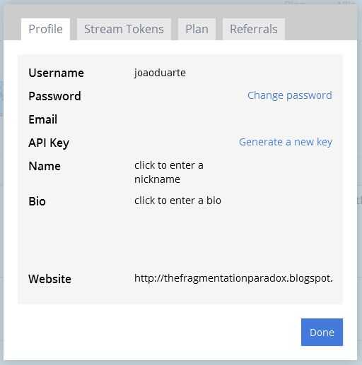 Para poder empezar a enviar datos a tu cuenta plotly de una API, primero necesitas tu clave de API. Ir a la configuración del perfil y haga clic en "generar nueva clave", en el campo clave de API. Ahora debe tener su nueva llave de API!