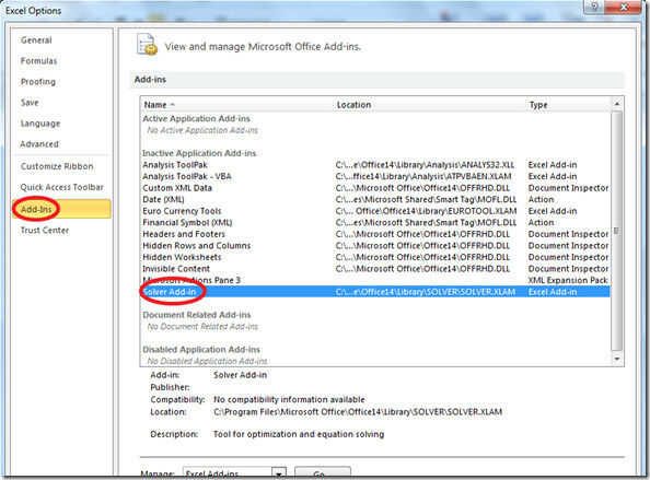 El complemento de solver se incluye por defecto en Microsoft Excel pero está deshabilitado hasta que el usuario lo permite para el uso. Hay unos sencillos pasos para activar solver. Para habilitarlo, puño necesita haga clic en el menú Archivo y luego ir a la pestaña de opciones. A continuación, las opciones de excel caja vendrá para arriba, haga clic en el add-in solver situado bajo el título de complementos y asegúrese de que está resaltado en azul. Ahora, haga clic en el cuadro de ir, que se encuentra en el administrar complementos de excel en la parte inferior de la pantalla de opciones de excel. Después de haber hecho clic en go se están el cuadro de add-ins. En el cuadro complementos Compruebe la casilla solver add-in, que se encuentra en el apartado de complementos disponibles y haga clic en el botón bien. Ahora solver ha sido permitido necesita saber cómo ubicar para su uso. Abrir excel y vaya a la ficha datos y haga clic en y todo el camino al derecha solver se encuentra en análisis.