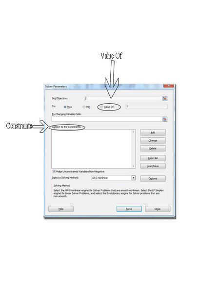Una vez que haga clic en la opción Solver, aparecerá el cuadro de diálogo parámetros de Solver. Una vez aquí, usted necesitará especificar los parámetros para ejecutar el solver. Estos parámetros varían dependiendo de su problema. El cuadro celda objetivo Set debe contener la ubicación de la celda de la función objetivo del problema bajo consideración. Max o min puede ser seleccionado para encontrar el máximo o mínimo de la celda de destino establecido. Si se selecciona el valor, el solucionador intenta encontrar un valor del destino de la célula igual a cualquier valor se coloca en el cuadro a la derecha de esta selección. El cuadro de las células debe contener la ubicación de las variables de decisión para el problema. Finalmente, se deben especificar las restricciones en el tema a la caja de limitaciones haciendo clic en Agregar. Cambio permite modificar una restricción ya entró y delete le permite borrar una restricción introducida anteriormente. RESET se borra todo el problema actual y restablece todos los parámetros a sus valores predeterminados. Opciones muestra el cuadro de diálogo Opciones de Solver. La selección de guess no es particularmente útil para nuestros propósitos y no se discutirán aquí.