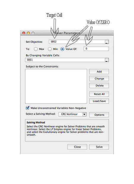 Set Target Cell: Solver está pidiendo para identificar la posición de la función que desea resolver. En este ejemplo la función fue colocada en la celda B2. Después de haber completado el paso 2 ir a solver y haga clic en él. Se abrirá el cuadro de diálogo parámetros de solver. Para establecer el destino celular debe utilizar los símbolos apropiados que excel entiende, usted no puede escribir en B2. Para fijar la célula diana correctamente usted debe escribir en $B$ 2.