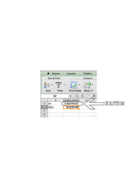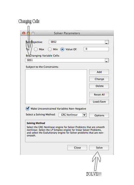 Conjunto cambiando las celdas: cambio de las células puede también llamarse celdas variables, porque su propósito principal es identificar las celdas que contienen las variables de la función. En el ejemplo del paso 2, B1 es la celda que contiene el valor de la variable x. Ir a la caja debajo de cambiando las celdas y tipo en $B$ 1, no olvide los símbolos de $ ni voluntad de excel no entiendo. Por último, haga clic en solve en la parte inferior de la caja de diálogo de parámetros de resolver y haga clic en resolver. Solver la operación le pide que ahora se realiza y le dará la solución x = 0, 850781. La solución aparecerá en la celda B1.