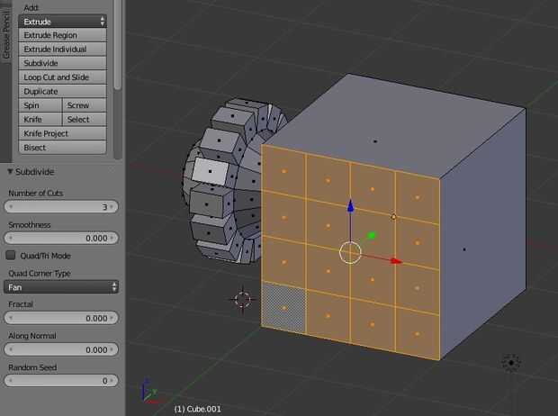 La herramienta subdividir toma las funciones seleccionadas y, no asombrosamente, subdivide las funciones seleccionadas en partes iguales de tamaño, así que un borde se dividirían en dos bordes y una cara se dividirían en cuatro caras más pequeñas. Después de utilizar la herramienta subdividir, aparecerá un menú de la izquierda donde usted puede ajustar el número de cortes junto con algunas distorsiones extrañas y características fractal (que no parecen de fractal como).