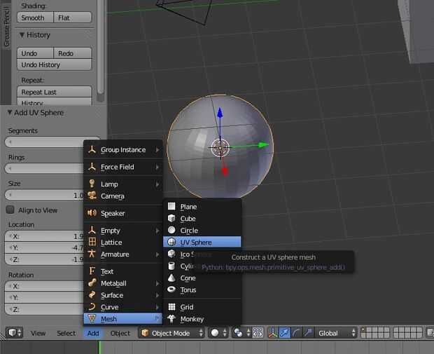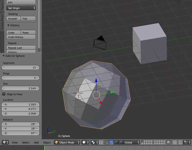 Una vez que la esfera de la UV ha sido colocada inicialmente, podemos hacer algunos ajustes iniciales a la esfera en esfera UV añadir el de la izquierda (que tenga que arrastrar el menú para ver todo). Aquí podemos ajustar el número de caras, anillos, tamaño, rotación y ubicación de este objeto particular o introduciendo un número en la barra de selección, haciendo clic en las teclas de flecha izquierda y derecha o haciendo clic y manteniendo pulsado el botón izquierdo del ratón en la barra de selección para arrastrar un invisible detrás de la barra y hacia atrás.