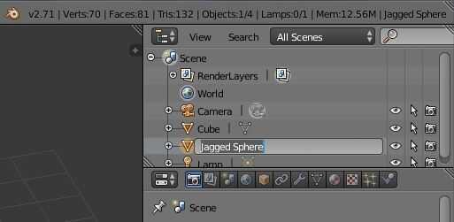 Luego podemos nombrar nuestro objeto mirando en la parte superior derecha en el Editor Outliner para el nombre del objeto en letras blancas y o haga doble clic o clic derecho para cambiar su nombre, junto con las otras características mencionadas en el paso 2.