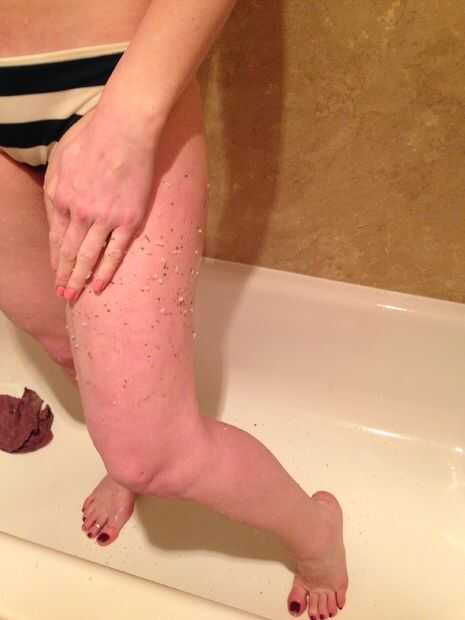 Desenvolver con cuidado el plástico wrap y disponer de ella. Enjuague el exceso de desintoxicación envolver en una ducha de agua caliente. Apague la ducha y aplicar "Calma las aguas exfoliante" con un vigoroso movimiento circular. Este paso exfolia las células muertas de la piel y ayuda a mover las moléculas de grasa de las células. Vuelva a encender la ducha y seguir frotando vigorosamente el exfoliante sobre el cuerpo entero como aclara apagado. Vigorosamente a ti mismo secar frotando con una toalla.