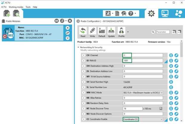 Ahora haga clic sobre él (primera imagen de arriba) y el campo CH por ejemplo "c" y el campo ID para por ejemplo "1001". Estos valores deben ser el mismo para todos los módulos de xBee para comunicarse con los demás. Ahora bien, como este xBee será nuestro transmisor, establecer el campo de la CE como "Coordinador". Si no establece la velocidad a 9600bps, cambiar a este valor.
