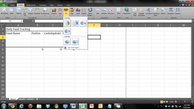 3. Haga clic en el icono de "Pie" en el menú "Gráficos" (también visto por call-out en el cuadro 1).