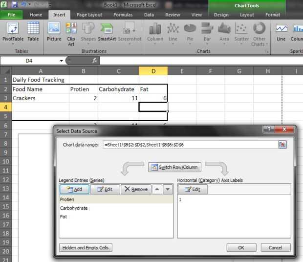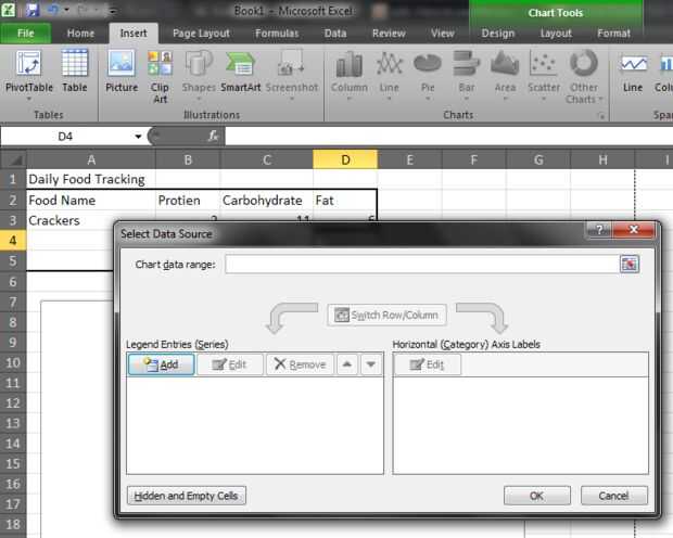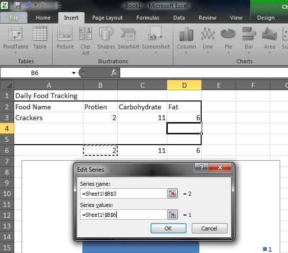 8. destacar el contenido en el cuadro de texto "Nombre de la serie", luego seleccione celda B2 (la celda con "Proteína" escrita).