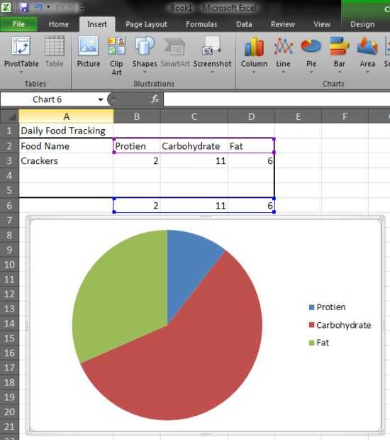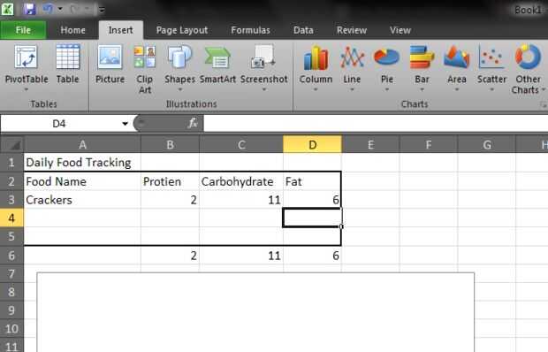 Ejemplo: Digamos que comer unas "galletas" con 2,0 gramos de proteína 6,0 gramos de grasa y 11,0 gramos de hidratos de carbono. En la celda A3 escribiría "galletas, en la celda B3 escriba"2", en la celda C3 escriba en el"11", y en la celda D3 escriba en 6. Mi libro de Excel entonces se vería el cuadro 1. Si se sigue gastando, poner el costo del artículo en la categoría baja bajo y deje otras células en blanco.