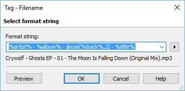 Qué esto salidas como el nombre del archivo es artista-Album - 01 – Song1. - Etiqueta de nombre de archivo es esencialmente el contrario del proceso anterior.