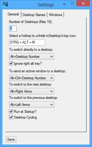 Simplemente haga clic derecho sobre el icono de la bandeja y golpeó a "configuración". Aquí puede elegir el número de escritorios que necesita. También puede dar sus equipos de sobremesa un nombre y puede forzar la herramienta se inicia automáticamente, al iniciar windows.