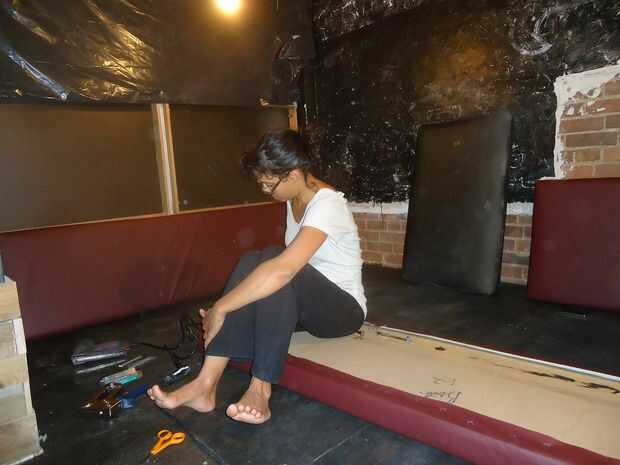 Primero hemos recogido algunos vinilos rojizo a un curso de venta de negocio (70% de descuento!). Este material sería fácil de limpiar y también no se desgastan tan rápido como tela. Las partes posterioras fueron removidas de las cabinas y un patrón del diamante fue dibujado en la parte posterior de madera. Los agujeros fueron perforados luego donde las líneas se reunieron (donde se añadirían los botones). Estos agujeros fueron perforados a través de la parte posterior de madera, la espuma y el viejo material negro en la parte delantera. De esta manera sería fácil conseguir la aguja grande para ir recto para sujetar el botón. Compramos a un montón de botones de gran abrigo de plástico negro (que tenían una cresta en la parte delantera para agregar algunos contraste a las espaldas de asiento rojo) junto con algún hilo de tapicería y agujas.
