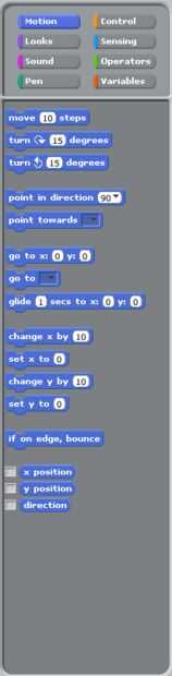 Esta es la zona de la paleta. En la parte superior, puede seleccionar si desea ver bloques de diversa naturaleza, representado por lo que dice el botón. (guiño). A continuación, puede arrastrar bloques al área de secuencias de comandos para hacer sprites para varias cosas. Nota: en forma de pieza de rompecabezas cosas significan van por encima/por debajo de otro bloque. Redonda u ovalada cosas (generalmente con el texto en su interior) aceptan números o valores. Puede arrastrar un bloque de ovalada a ellos o escriba un número. Si hay un menú desplegable, también puede elegir de eso. Áreas de cuadrados aceptan bloques de texto, números u ovalada. Zonas puntiagudas aceptan cosas que son verdaderas o no verdaderas. Por ejemplo, "A = B" o "puntero del ratón tocando" son algunas opciones. Casillas de verificación permiten su valor para mostrarse en el escenario junto con una etiqueta. También, si usted haga clic en cualquier bloque, ya sea en la paleta o en el área de secuencias de comandos, si hace clic en ayuda, aparece una ventana que están (en cero) explica lo que hace que el bloque particular.