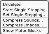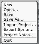 Ahora voy a intentar ir por los menús. todo lo que es obvio lo que hace que no mencionaré. Los primeros tres botones le permiten elegir su idioma y guardar (cmd-S o ctrl-S, también funciona) o subir tu proyecto a scratch.mit.edu. En el menú deile F, lo único de interés es Notas de proyecto... Esto le permite editar sus notas del proyecto. Cuando subido al sitio, estos aparecerán a la derecha y ligeramente hacia abajo desde la parte superior de su proyecto. ADVERTENCIA: la mayoría de la gente no siempre lea, así que es mejor poner las instrucciones en el juego. Del menú edición es muy interesante. Undelete (cmd-Z y ctrl-Z, gente!) SÓLO recupera el último script borró. NO DESHARÁ NADA! Solo caminar solo parpadea el bloque está en el momento y va un bloque en un momento. Muy lento, pero útiles para saber lo que va mal. En Conjunto solo paso a paso... se puede elegir ir en velocidad turbo (obvio lo que se trata), bloques de normales, flash rápido (como único solamente más rápido), o flash bloques lento (normal solo caminar). El comando Mostrar bloques de Motor es para uso con Lego WeDo, que es compatible con Scratch. No tengo ninguno, así que no puedo explicarlas. Casi listo! Ayudar a la pagina... y Pantallas de ayuda... a la ayuda en el sitio Web. Sobre cero h... muestra información acerca de esta versión en un popup.