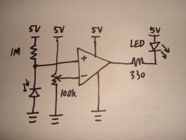 (1) transmisor de IR brillará directamente al receptor de infrarrojos. Receptor IR está conectado en sentido inverso parcial con una resistencia de 1M ohm serie. Esto crea un divisor de potencial para el amplificador operacional no invertir de entrada, V +.