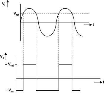 (4) desde V + > V-, la salida del amplificador operacional será 5V. En este caso, se apaga el LED. Sólo cuando V + < V-, la salida del amplificador operacional es 0V, así el LED se enciende para arriba.