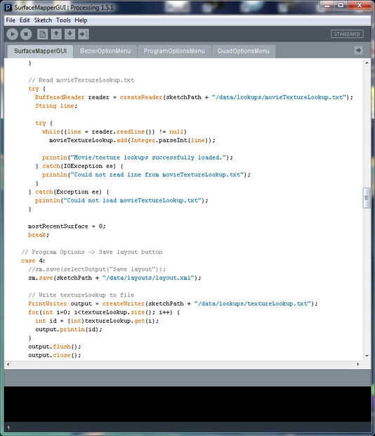 - Abrir SurfaceMapperGUI de archivo de procesamiento > menu Sketchbook, a continuación, haga clic en el botón ejecutar para iniciar el boceto.