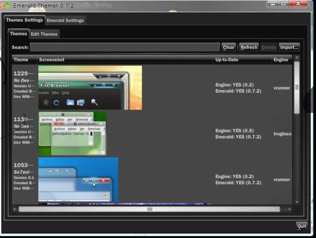Espero que todavía tienes Compiz Fusion Icon en tu panel. Si no, volver al paso 2. Si por lo tanto, buena. Haga clic con el botón derecho Compiz Fusion Icon y haga clic en gestor de temas Emerald. Ahora debería ver lo que está en la imagen superior (excepto sin los temas). Haga clic en importar y espero que te acuerdas de donde pones el archivo de tema de Esmeralda. Por esta razón se recomienda guardar en el escritorio, ya sabes donde está. Haga doble clic en el archivo de tema de esmeralda y debe estar en el menú. Ahora, haga doble clic y usted debería ver tu tema. Disfrute de su nuevo tema (s)