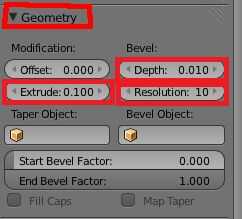 Ahora zoom en el texto mediante el desplazamiento de la rueda del ratón. A continuación, haga clic en la F en la barra de la parte superior derecha para abrir las propiedades para el texto. En la pestaña geometría cambiar la profundidad a.01 la extrusión a la.1 y la resolución de 10.