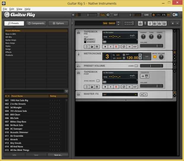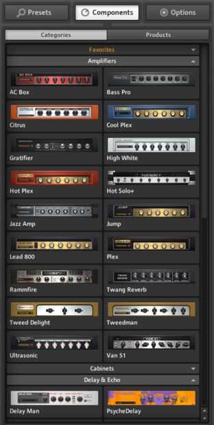 Usted encontrará toneladas de tonos predefinidos y sonidos disponibles en el menú de la izquierda, preseleccionado por el tipo de estilo o amp. También hay sonidos de firma hecha de antemano de famosas canciones de varios géneros y estilos.